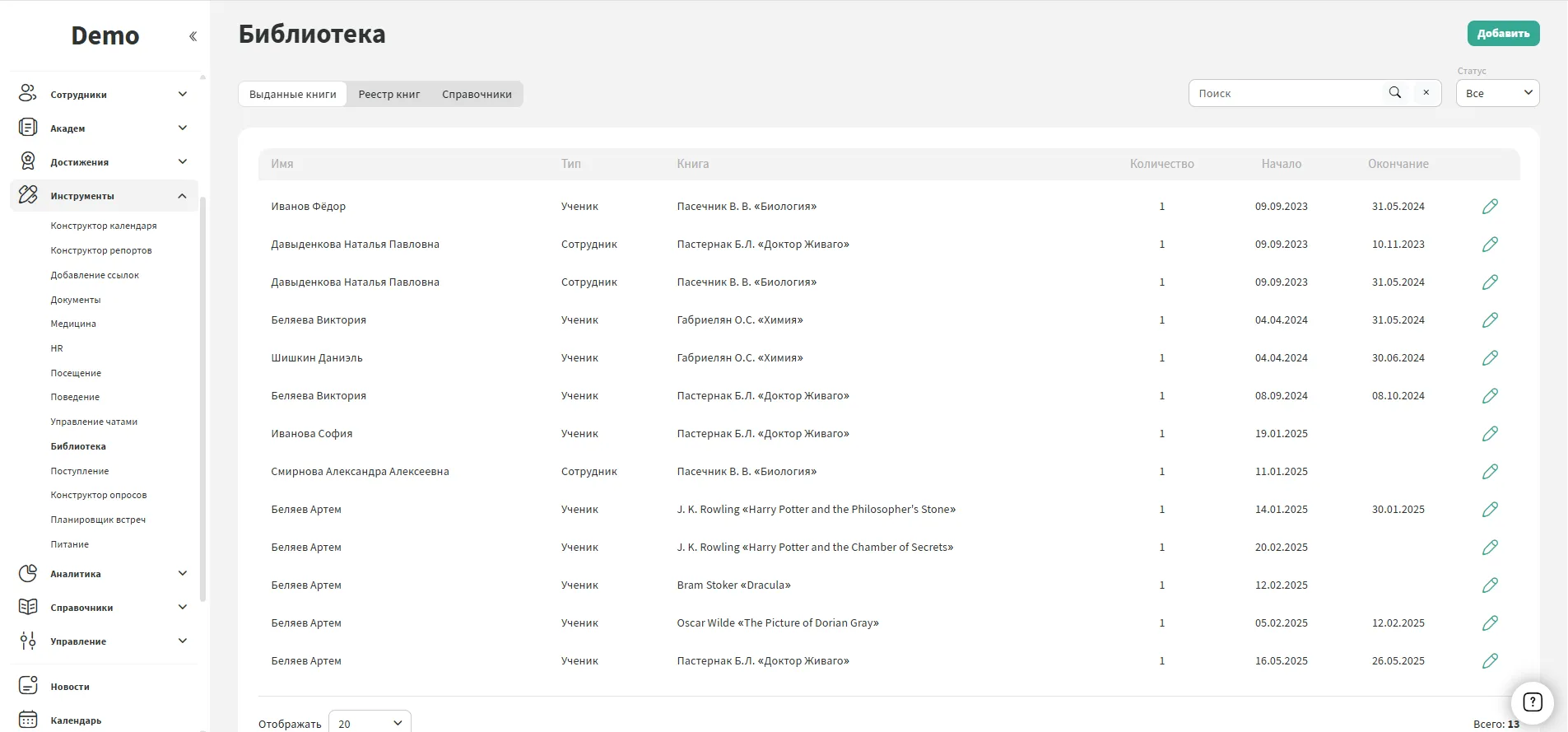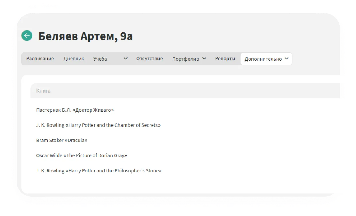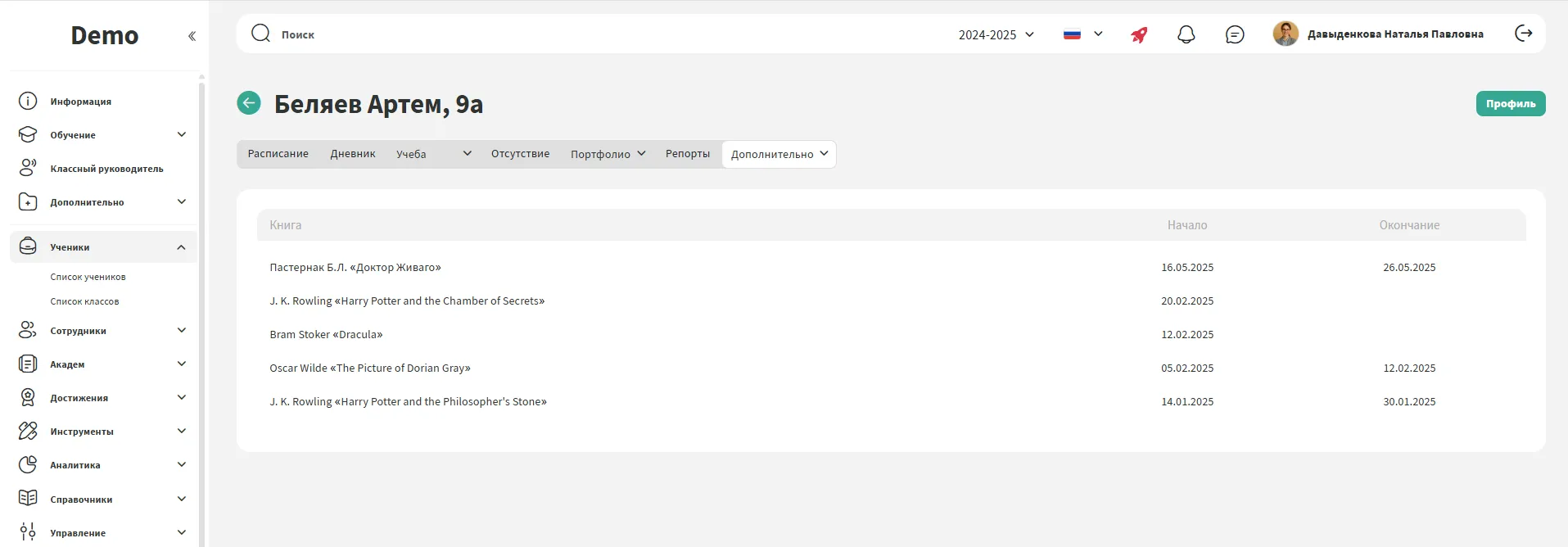 Ученик и сотрудник видят в своём профиле, какие книги у них на руках и когда их нужно вернуть. Это снижает потери и упрощает контроль.