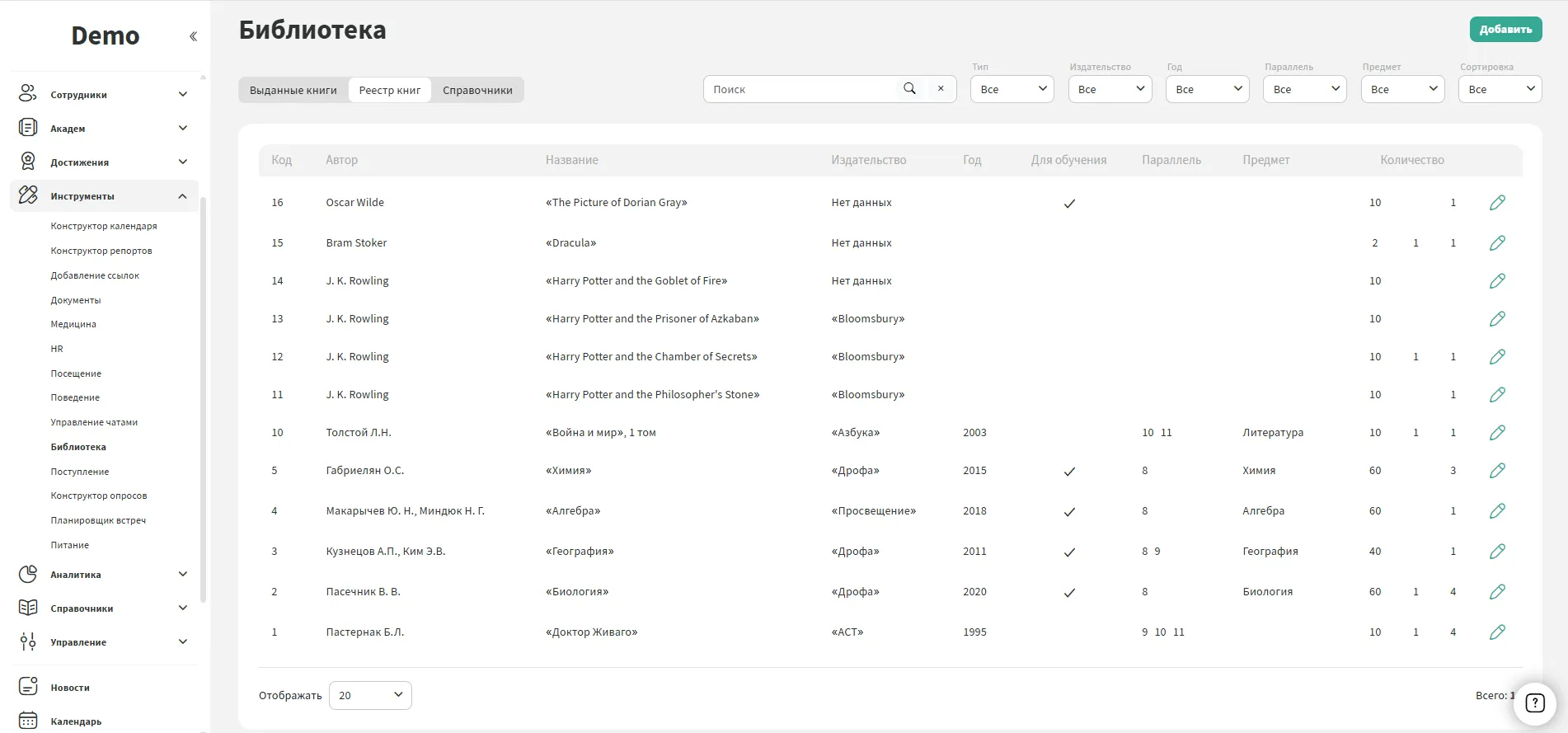Добавляйте книги по названию, автору, издательству, отмечайте количество экземпляров и назначение (учебная, художественная и др.). Вся информация хранится в едином реестре.