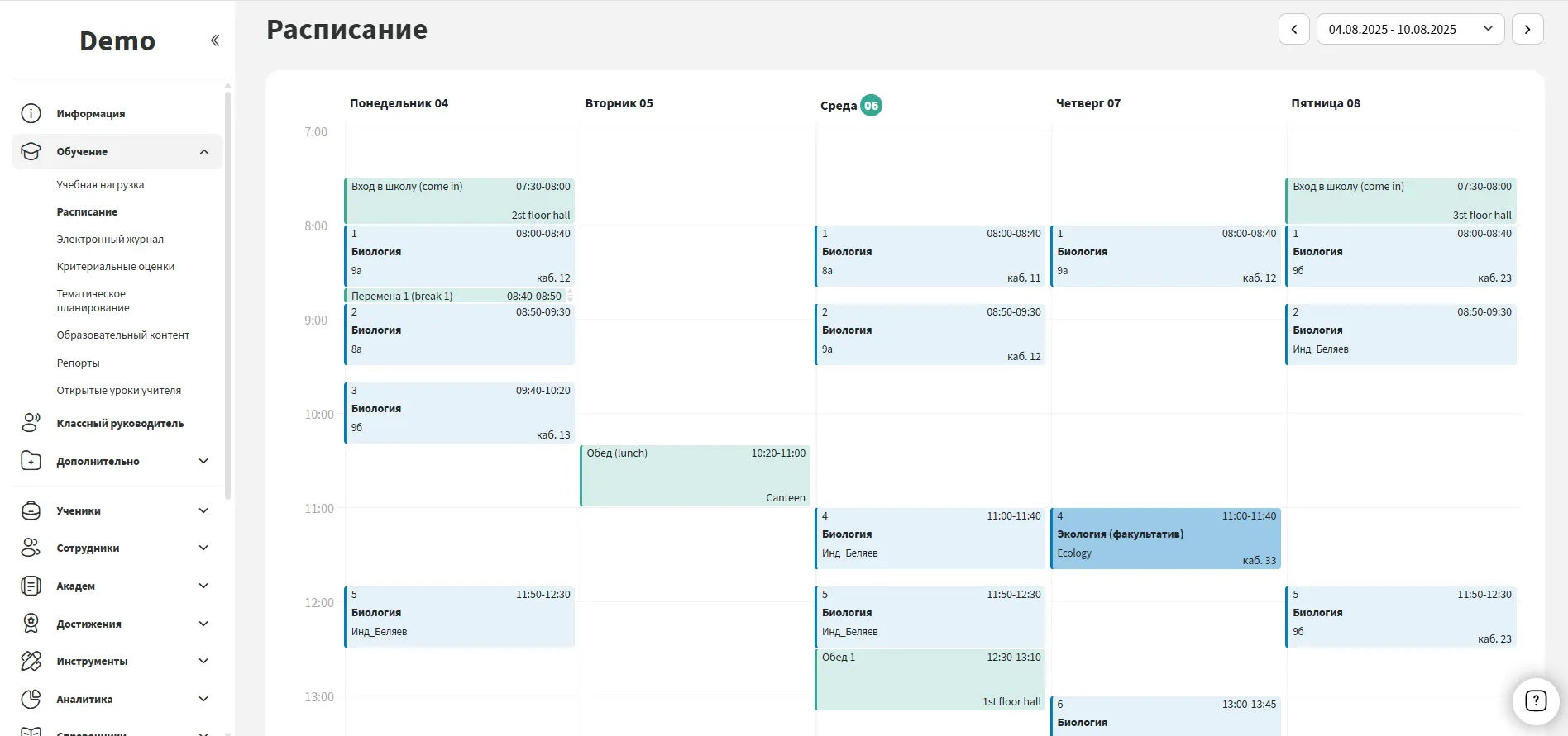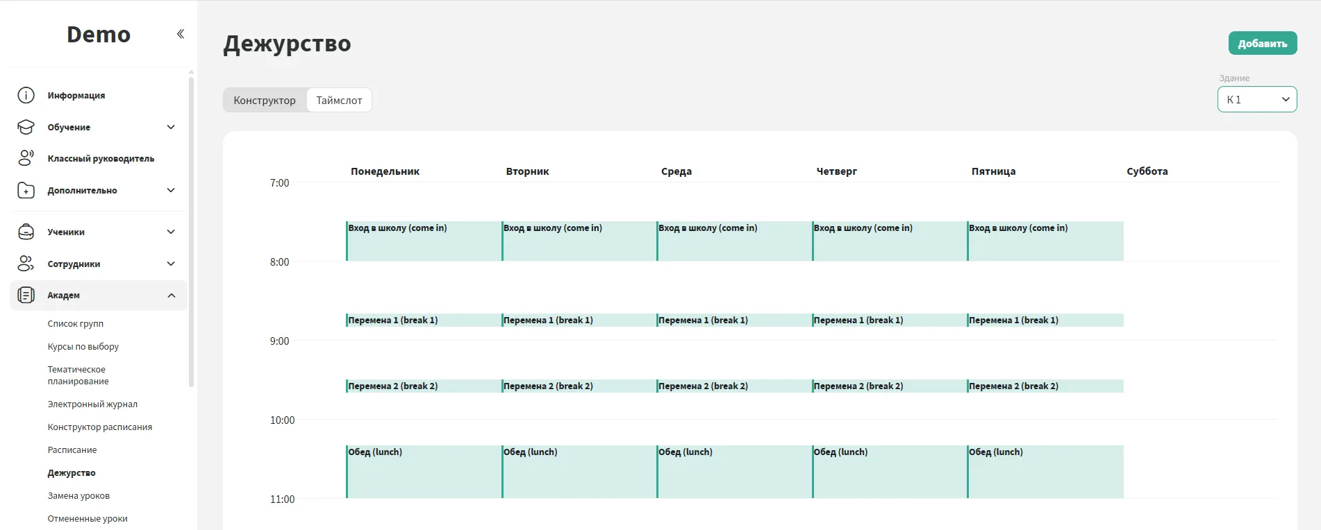 Система позволяет задать точные интервалы дежурств с привязкой к зданиям и дням недели.