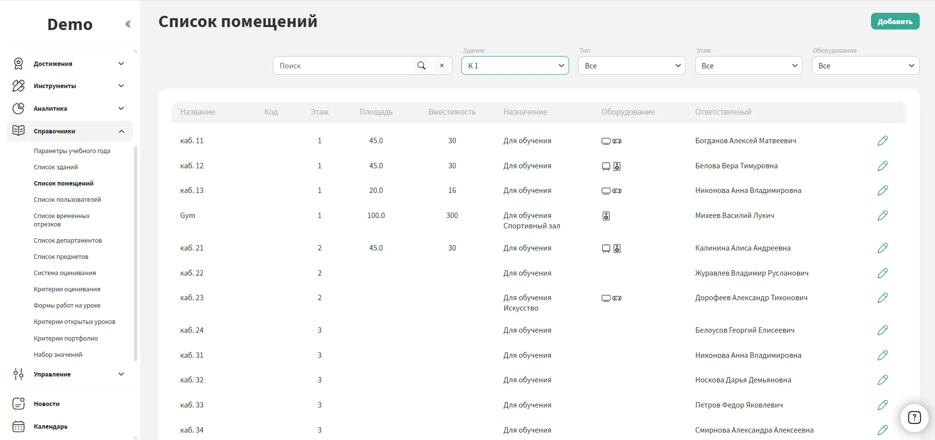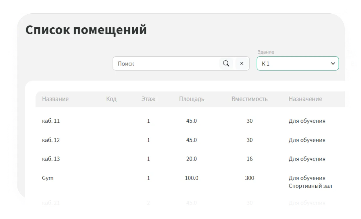 Создавайте список кабинетов, залов, рекреаций и жилых комнат. Система учитывает этаж, площадь, вместимость и тип использования (обучение или проживание) — всё это влияет на работу расписания и логистики.
