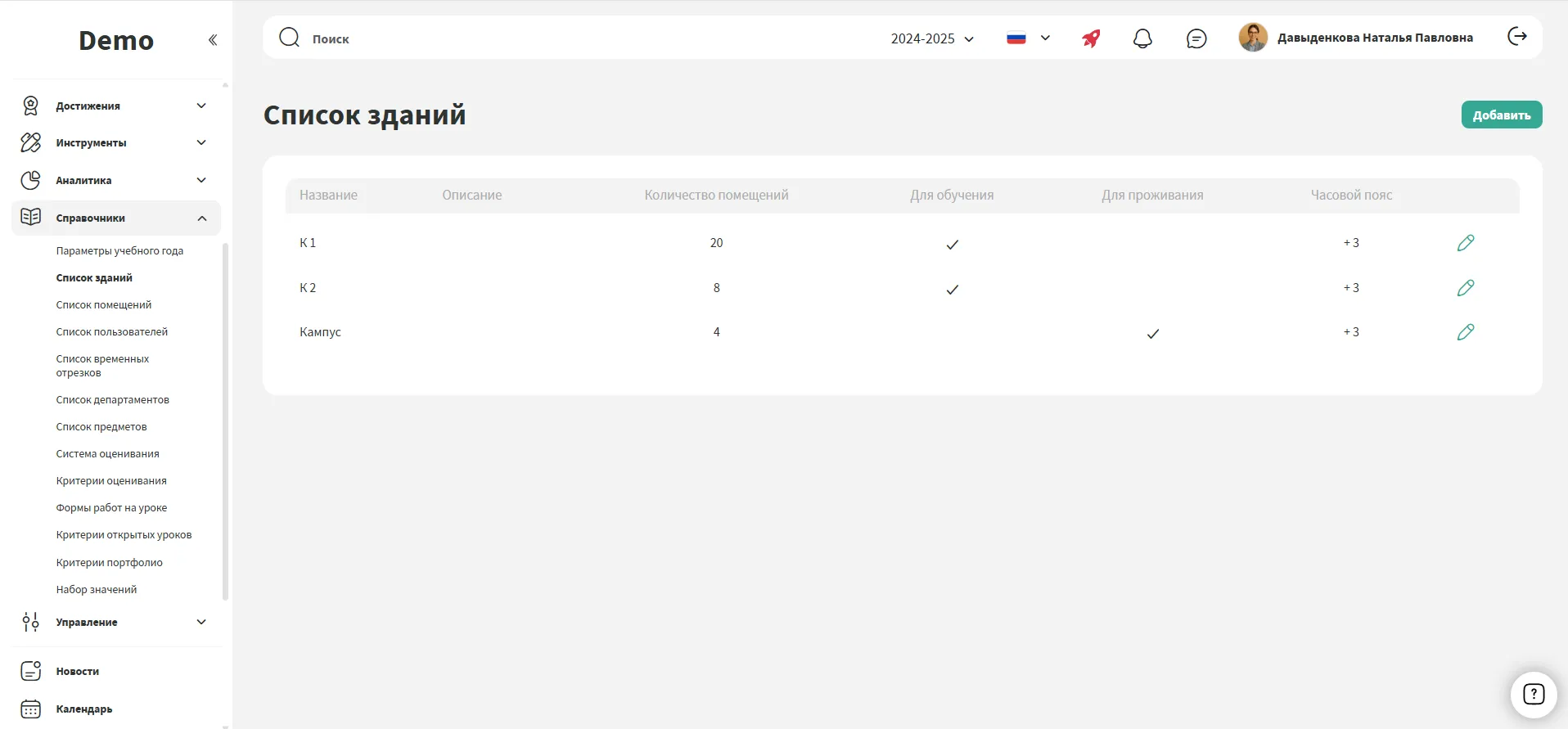 Добавляйте неограниченное количество корпусов с адресами и часовыми поясами. Это помогает точно распределить учеников и сотрудников, а также учитывать специфику школ в разных локациях.