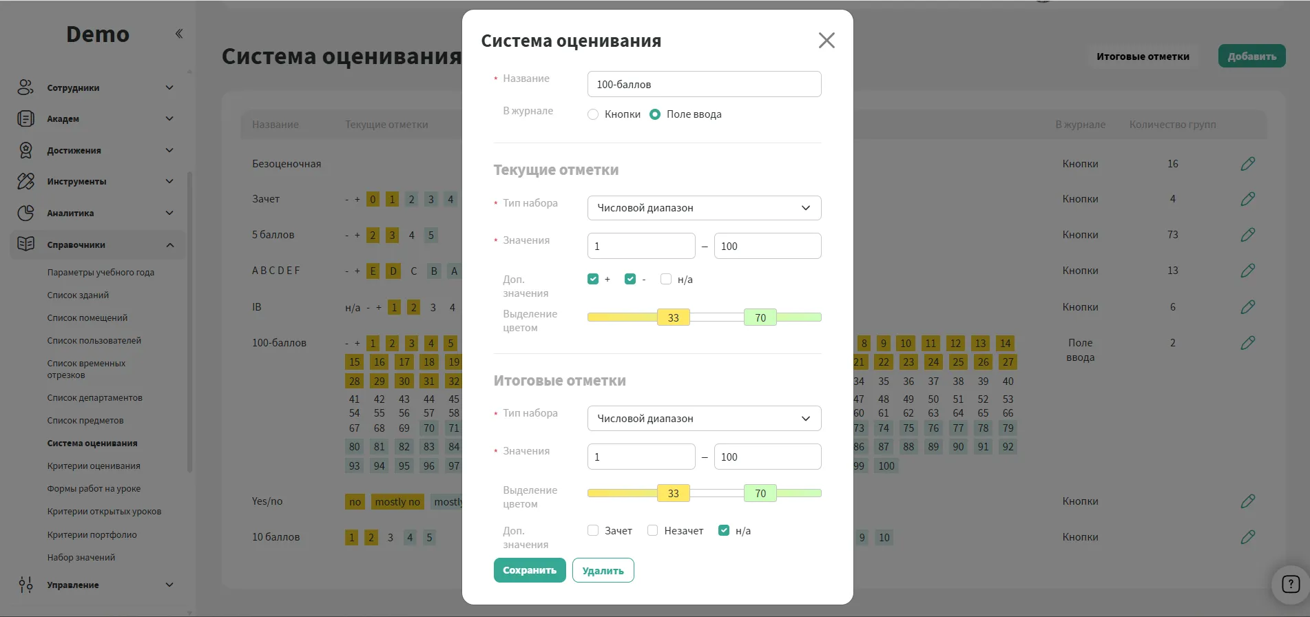 Пятибалльная, стобалльная, символьная или зачет/незачет — задайте свои шкалы и диапазоны. Можно задать разные шкалы для текущих и итоговых отметок.
