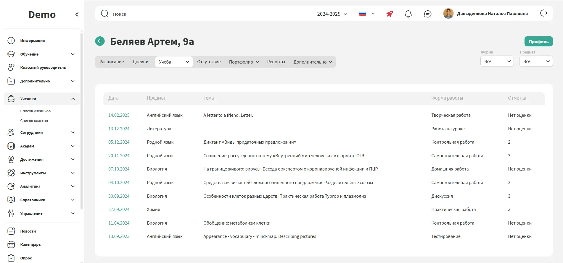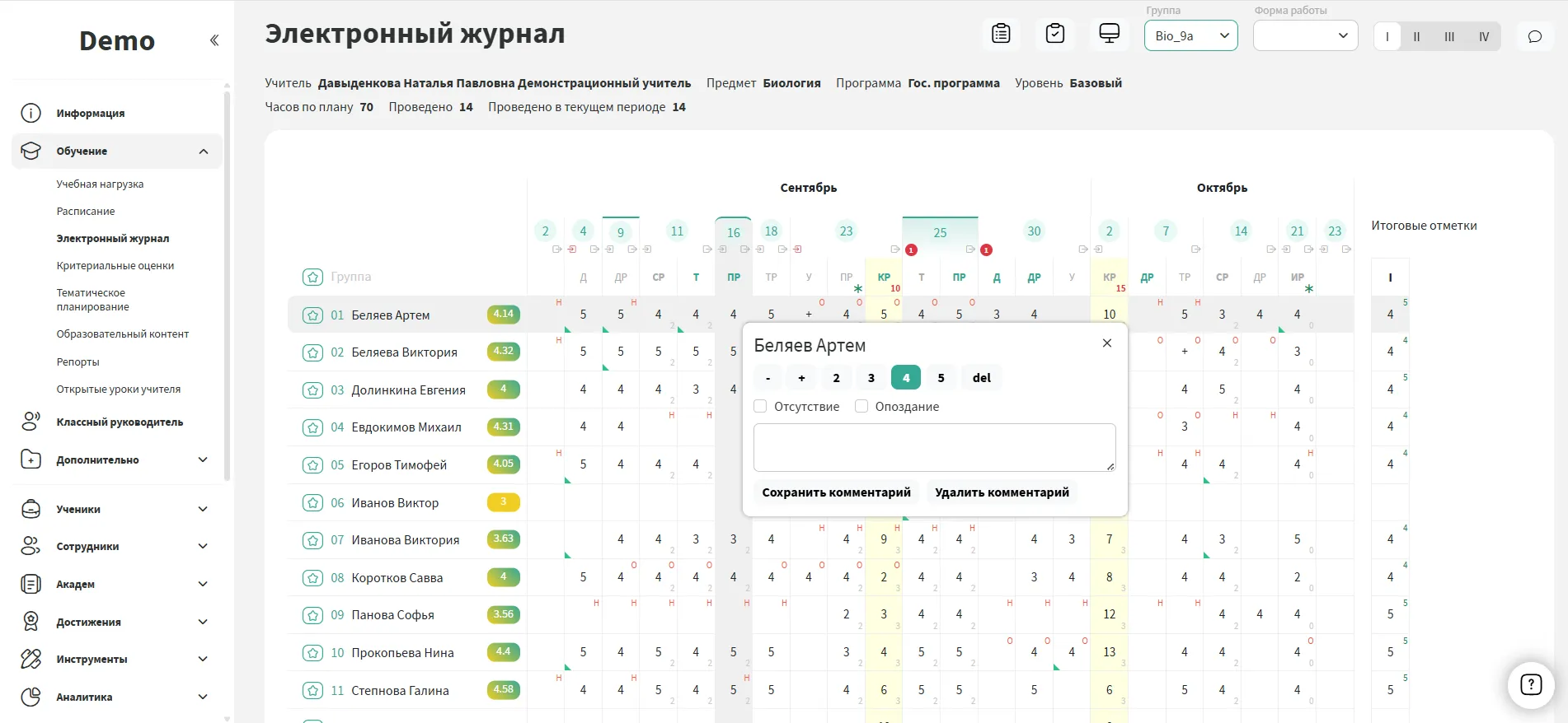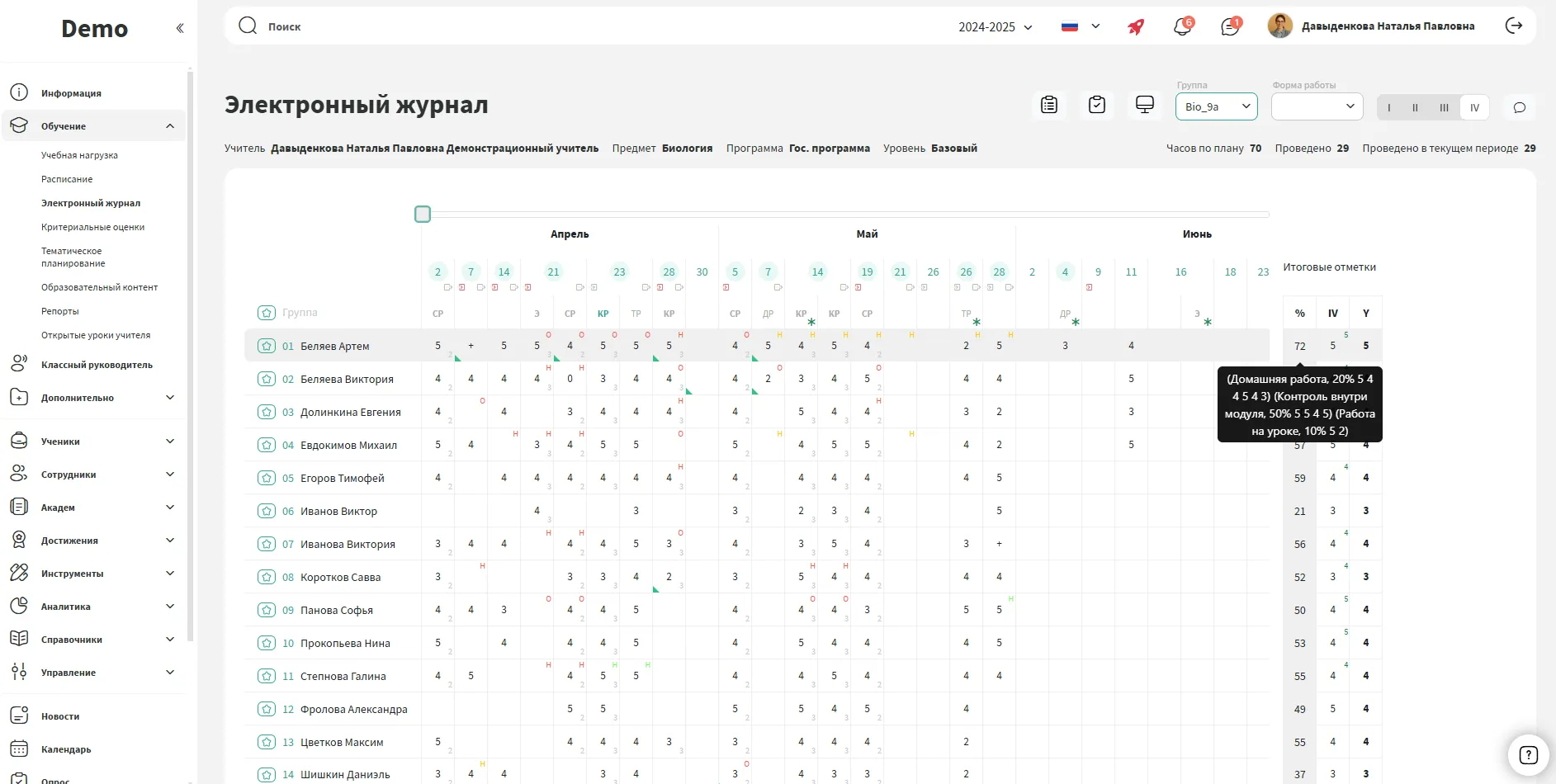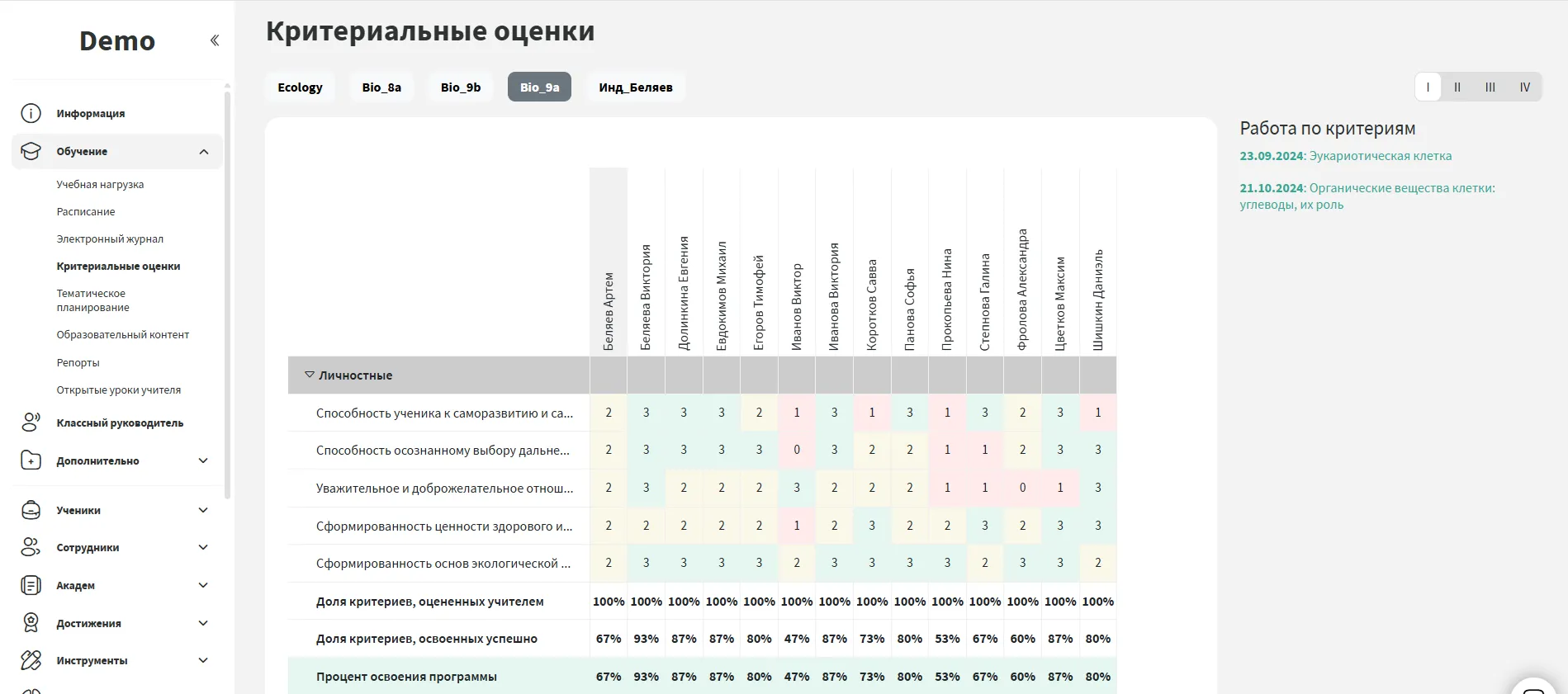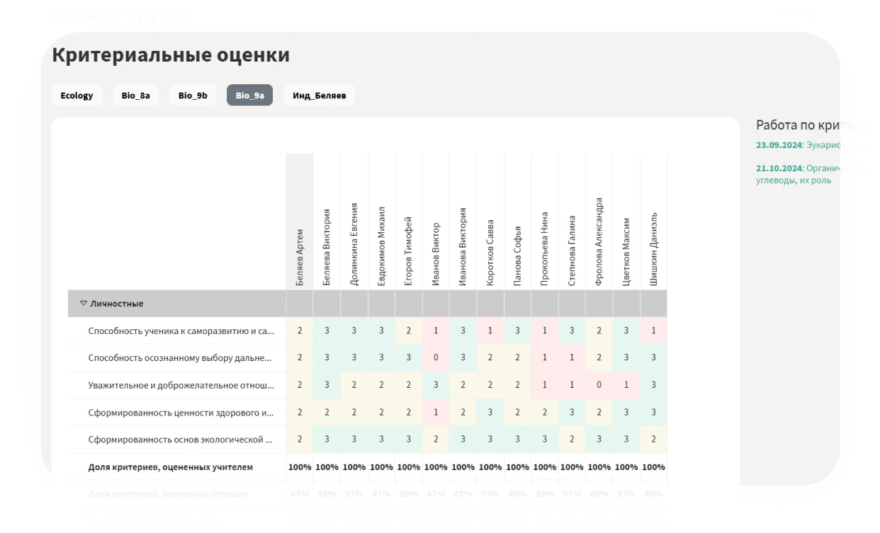 Система позволяет проводить критериальное оценивание — учителя могут выставлять баллы по критериям, отслеживать освоение навыков и видеть прогресс в разрезе каждого ученика. Система визуализирует прогресс: освоенные навыки, проблемные зоны, широту и глубину усвоения.