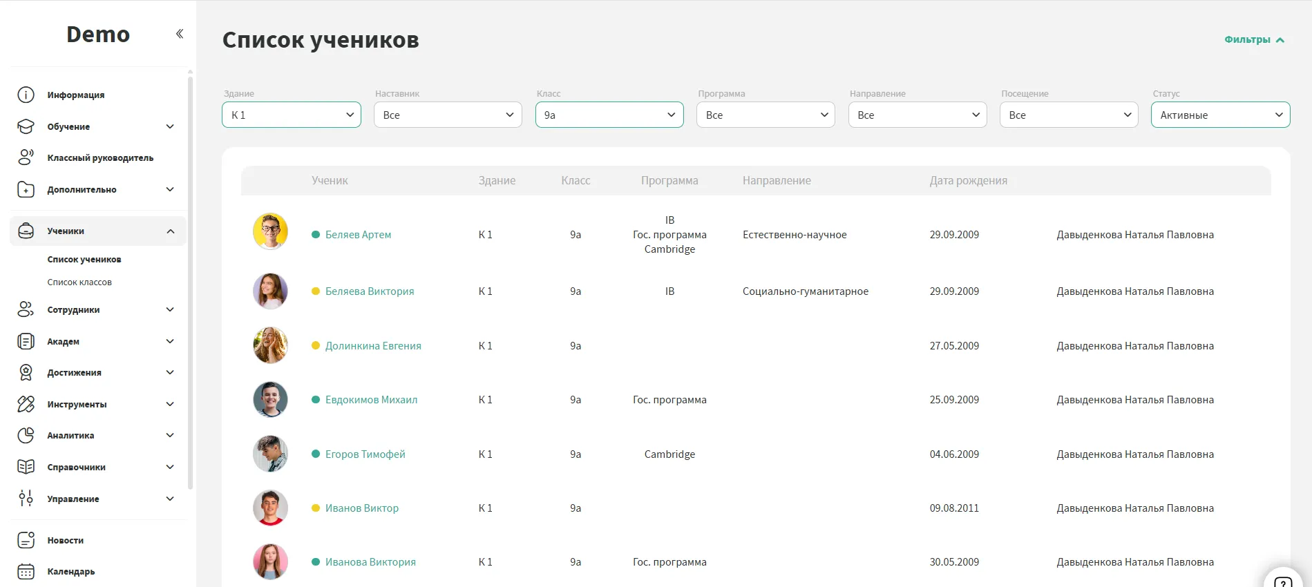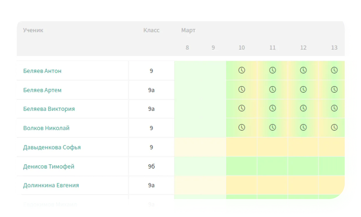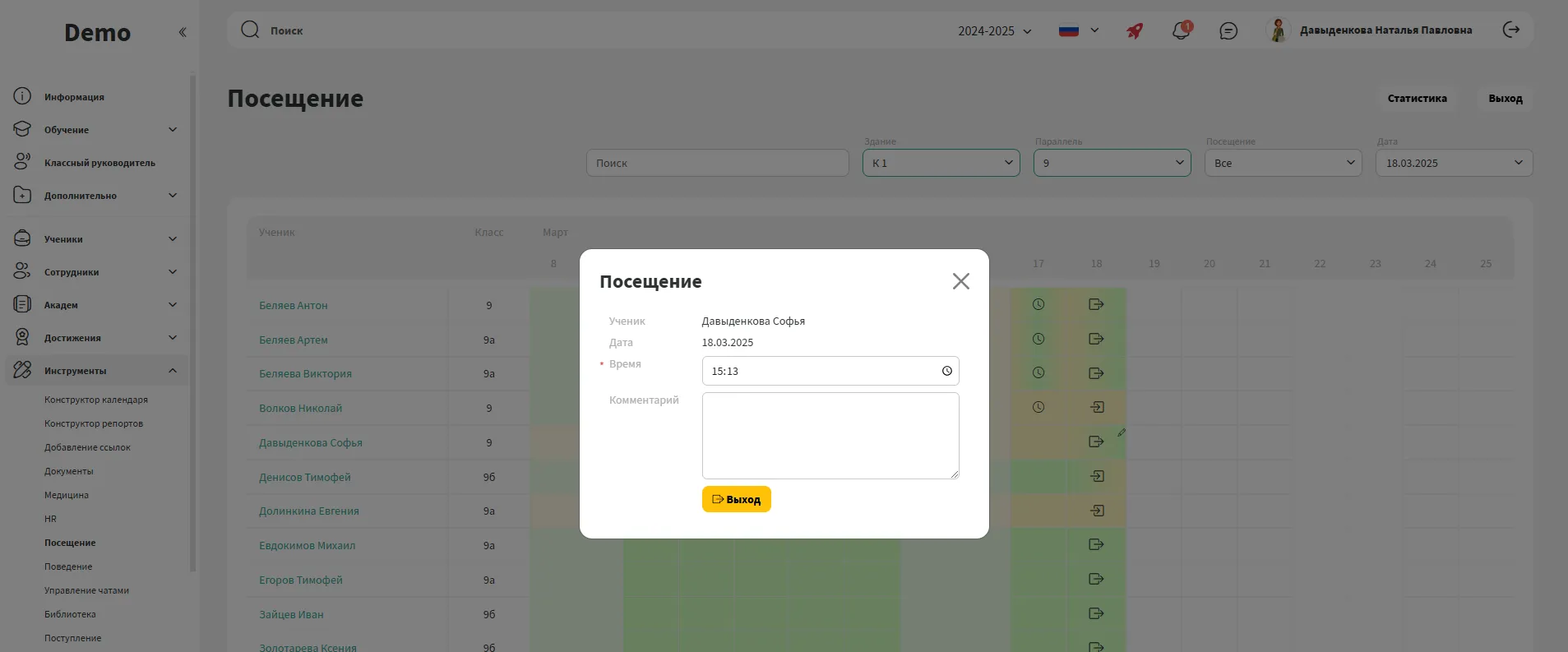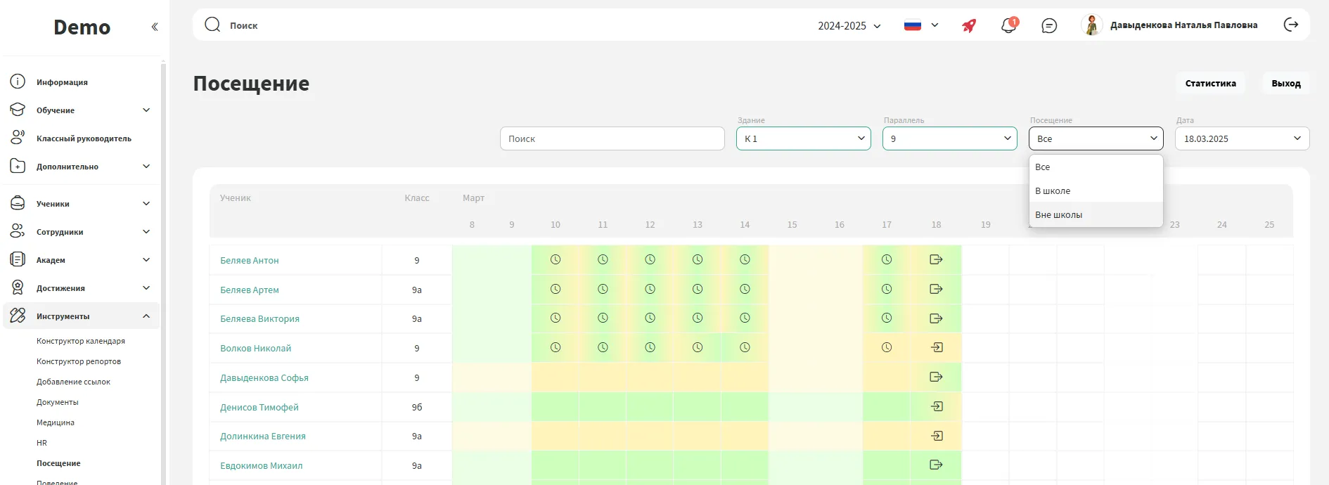 В любое время вы видите, кто сейчас в школе, а кто за её пределами — через фильтры или метки в списке учеников.