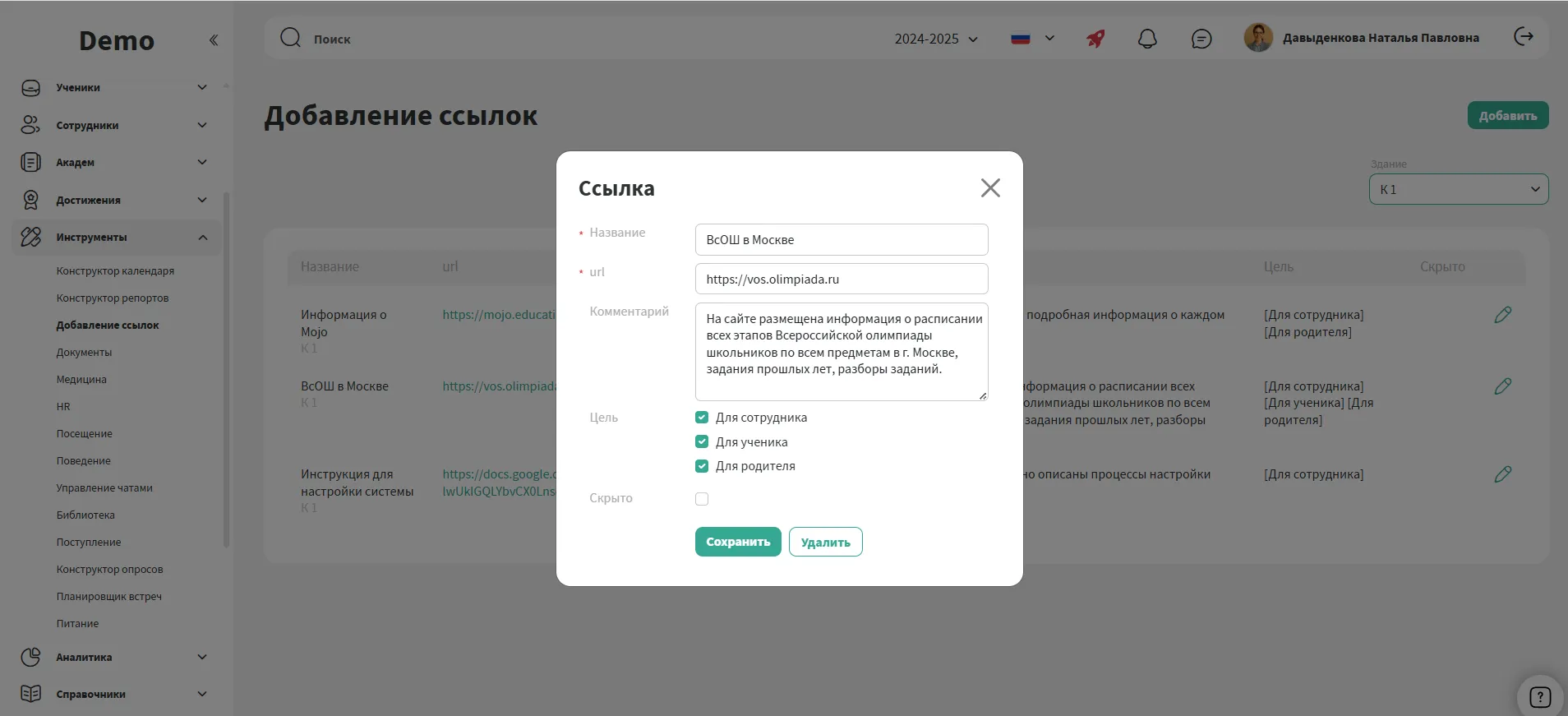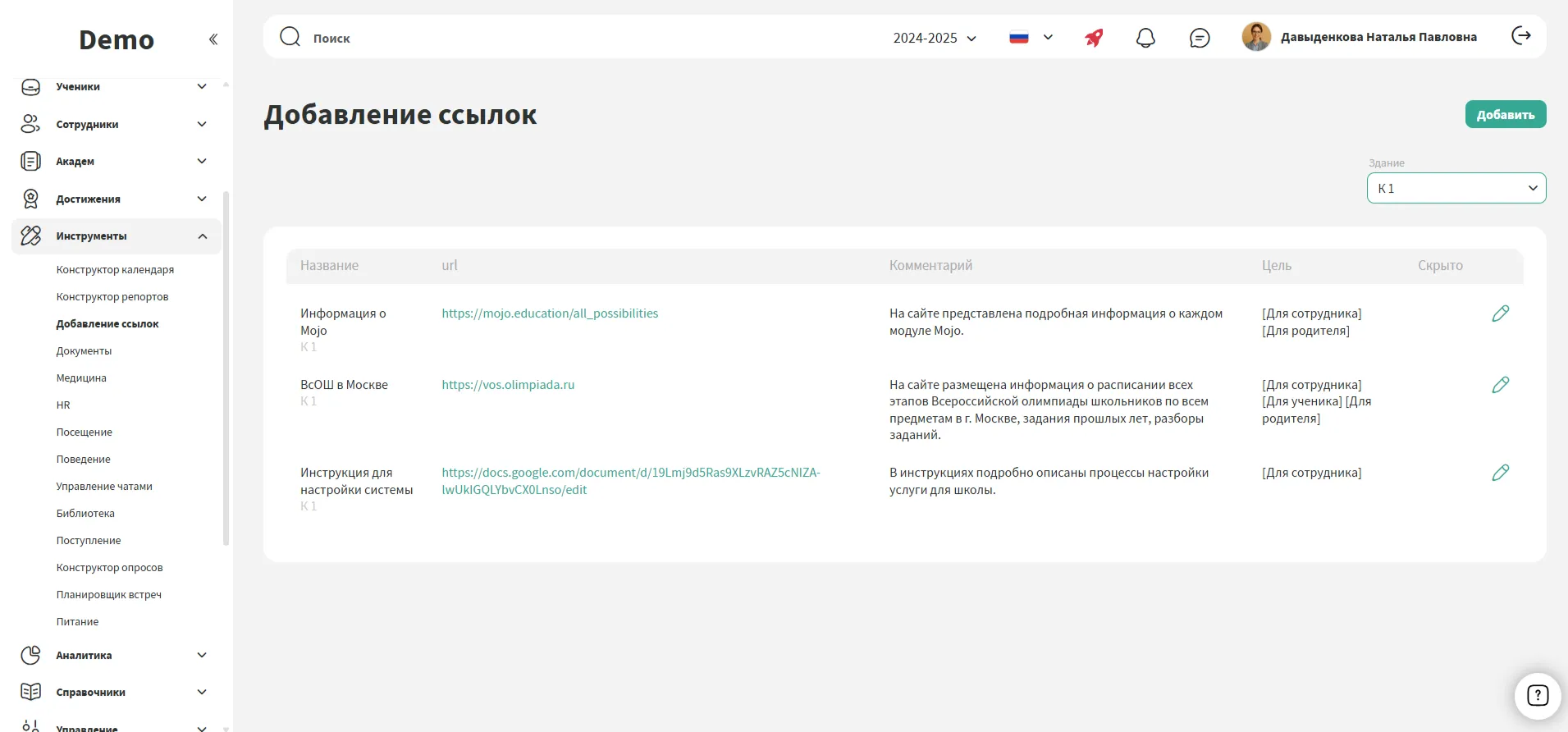 Настраивайте, кто именно видит каждую ссылку: ученики, родители или сотрудники.