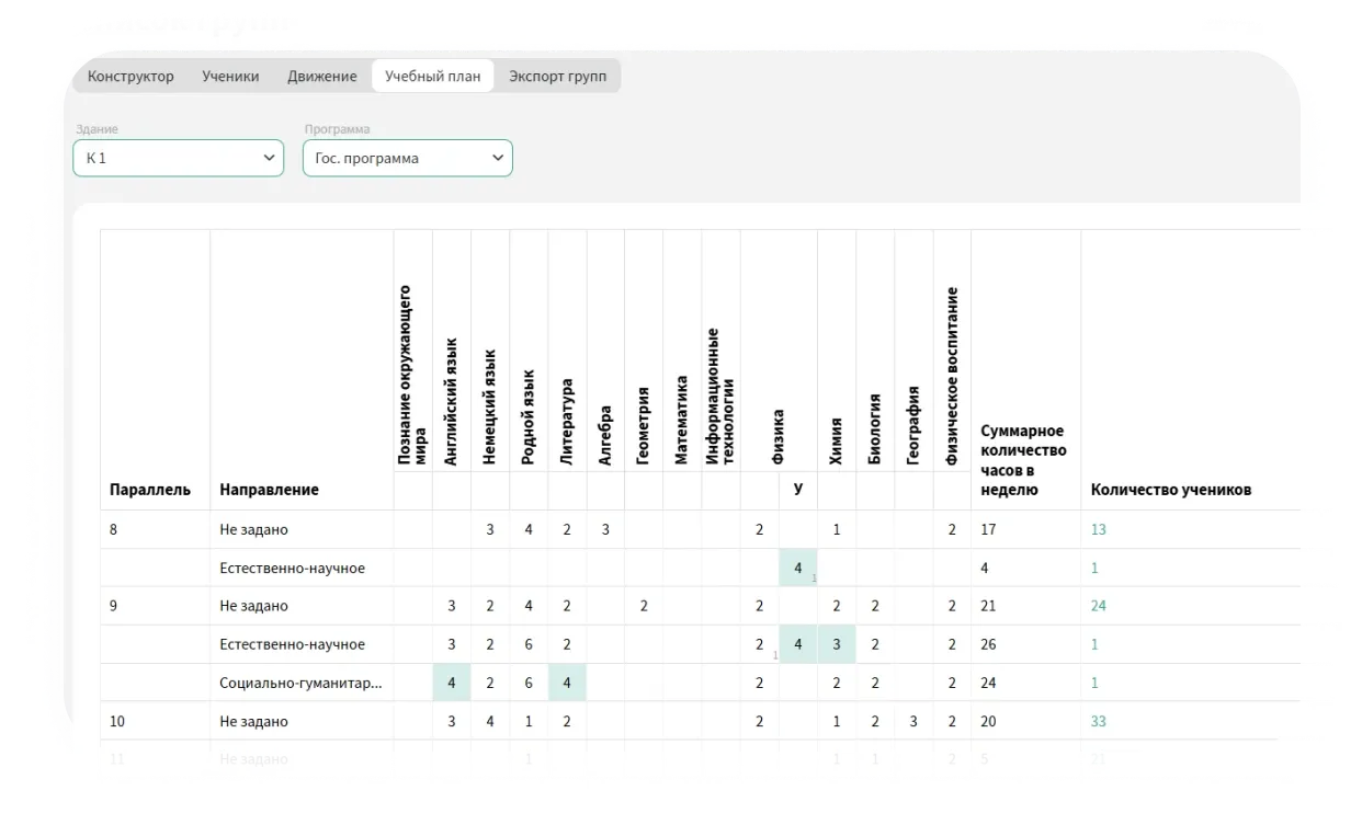Учебный план в Mojo позволяет школе наглядно распределить часы по предметам, определить уровень изучения и быстро сверить соответствие учебных групп плану.