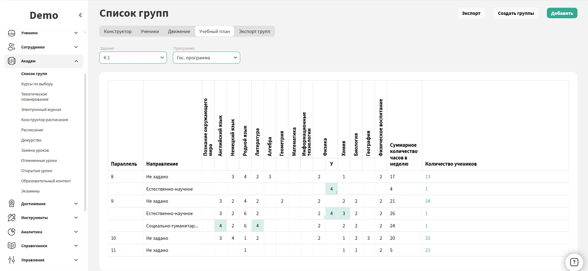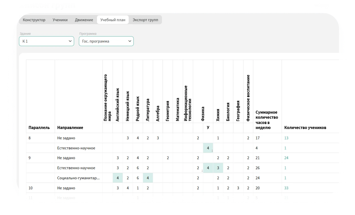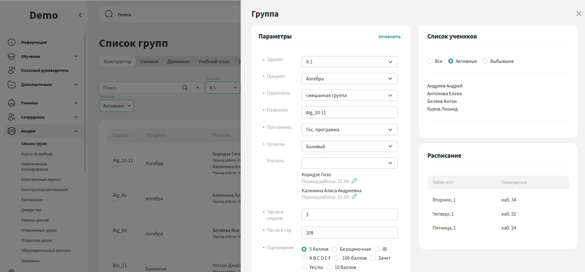 Группа объединяет учеников, учителя и параметры изучения предмета — уровень, программу, количество часов. Группы могут быть однородными (все ученики одного класса) или смешанными (из разных классов и параллелей).