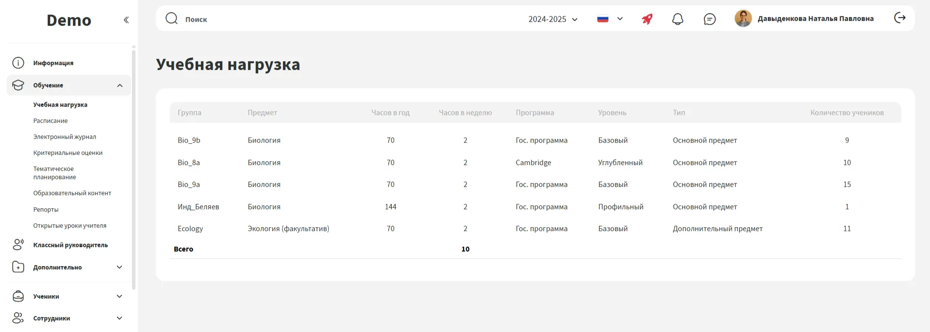 Нагрузка учителя автоматически рассчитывается на основе групп и учебных планов — она видна в личном кабинете педагога.