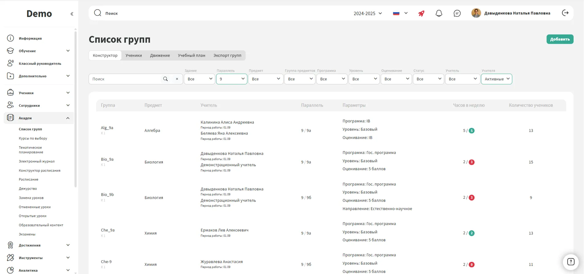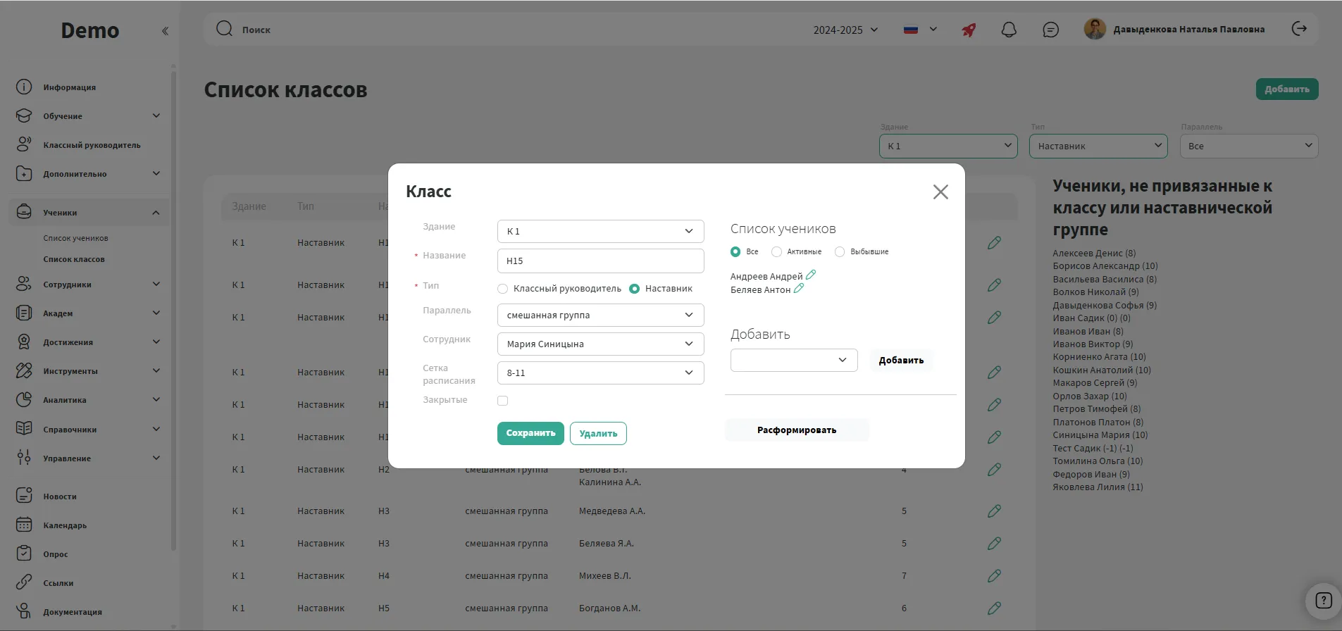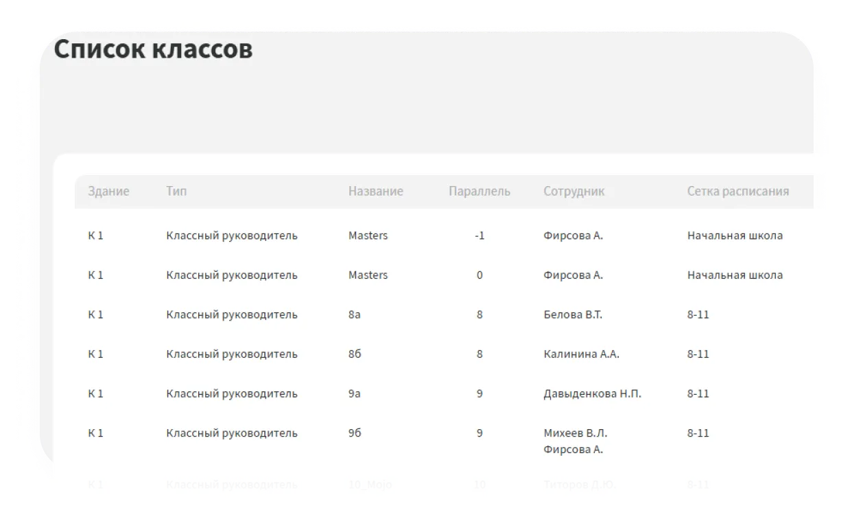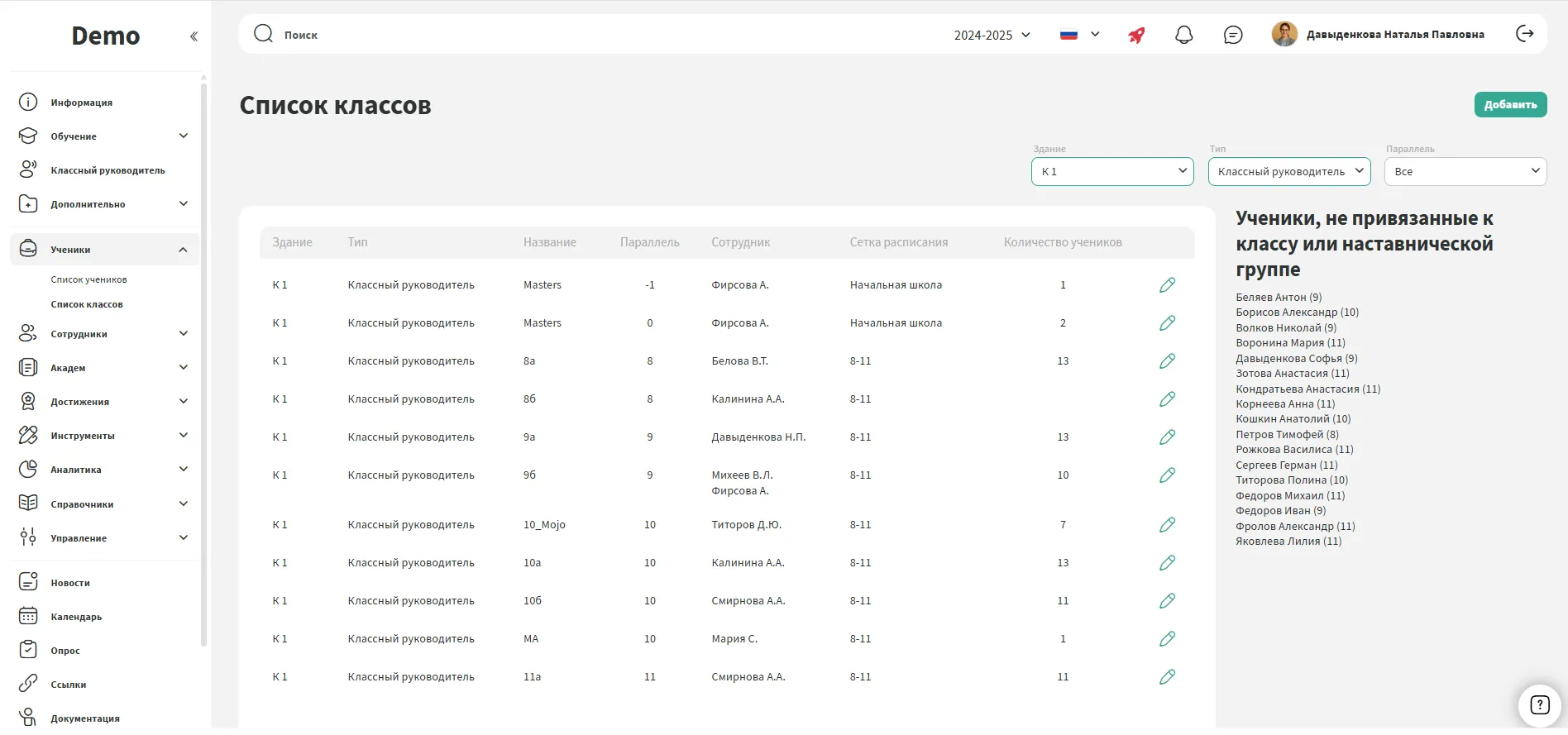 Создание и ведение классов позволяет систематизировать данные об учениках, закрепить классных руководителей и обеспечить доступ к аналитике по каждому классу.