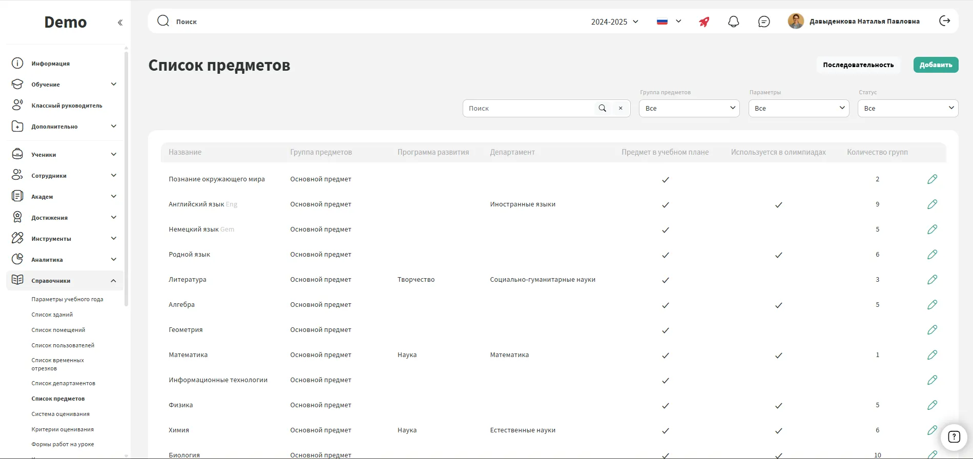 Справочник предметов позволяет школам задать собственный учебный план. Настроенные предметы используются в журнале, расписании и отчетах по успеваемости.