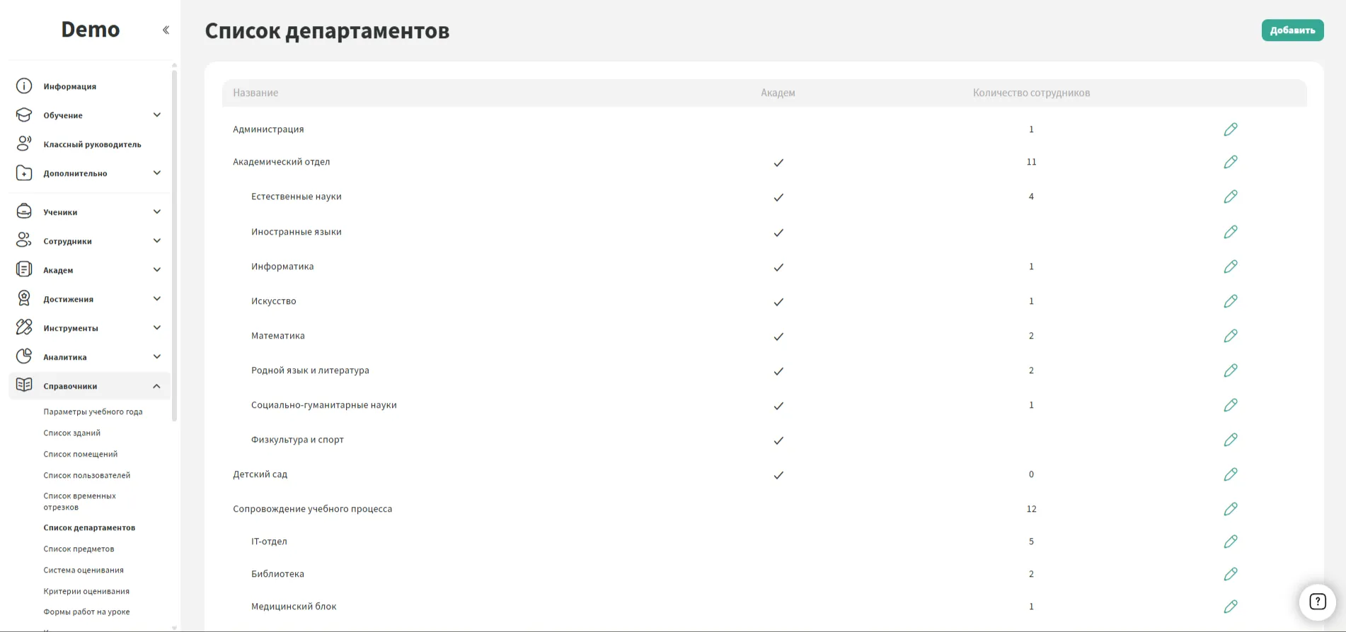 Формируйте учебные департаменты и распределяйте учителей по направлениям. Это упрощает назначение нагрузки, поиск замен и аналитику по предметным областям.