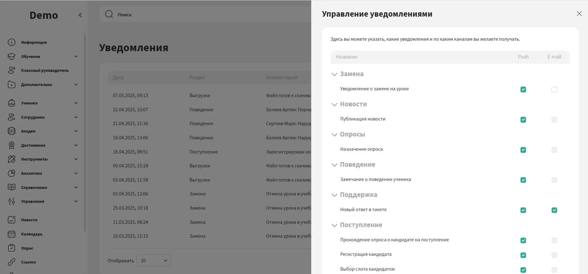 Пользователь сам выбирает, какие уведомления ему нужны и через какой канал их получать.